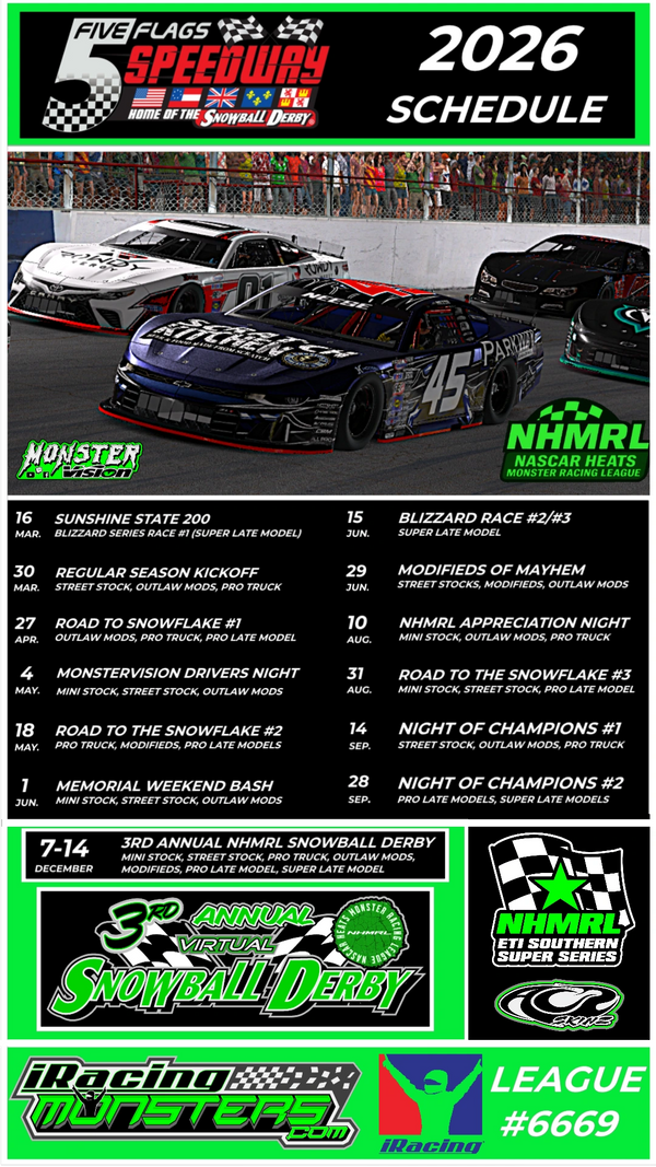 THE NHMRL 2026 Schedule is being built and is coming together as we will follow the actual Five Flags Schedule with several series this year and we will be racing the full ETI Southern Super Series schedule this year!